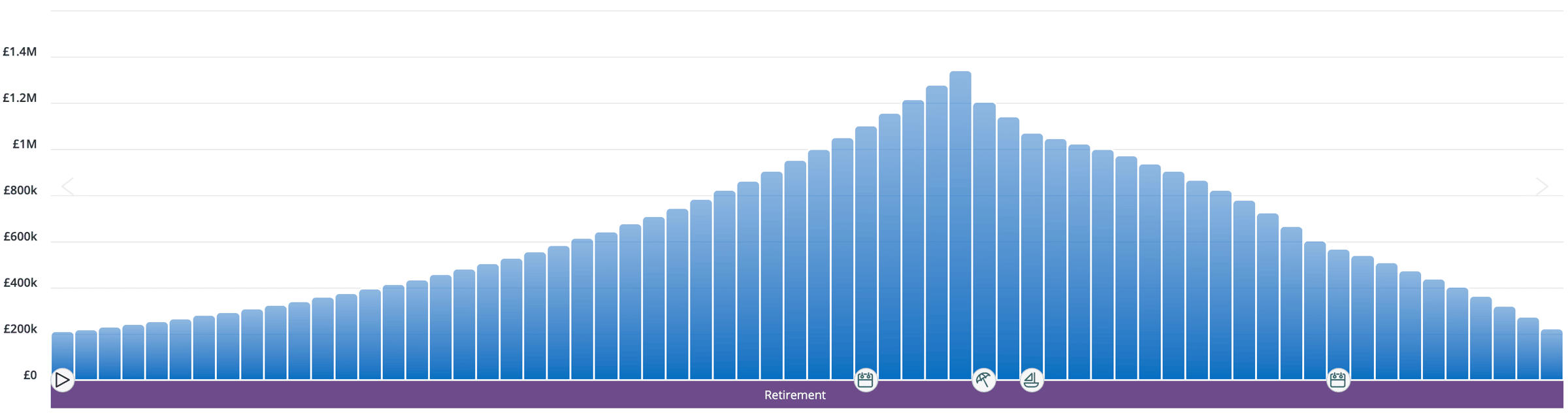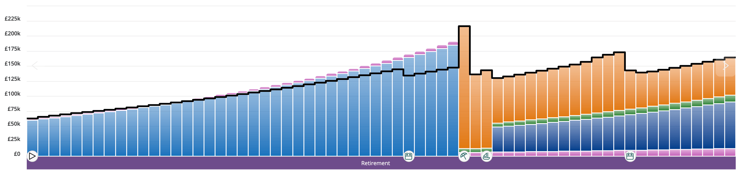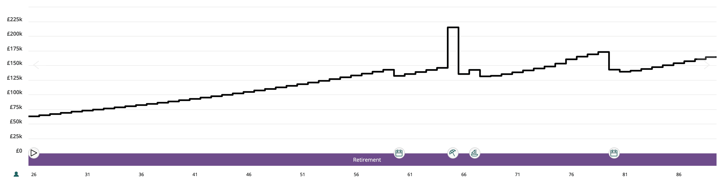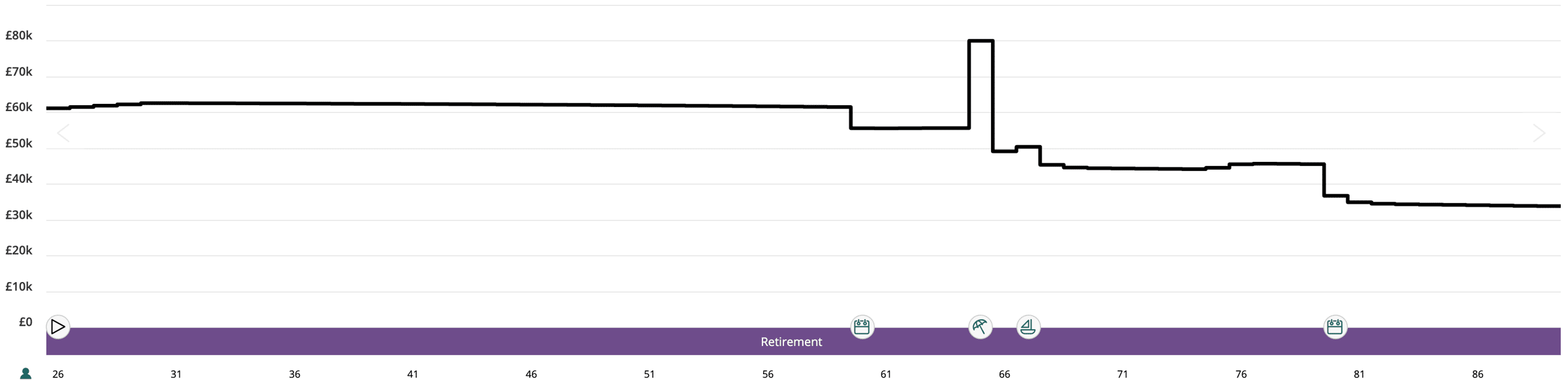 This chart shows the value of the private pension over time - see how it slowly erodes after retirement age (based on our assumptions.