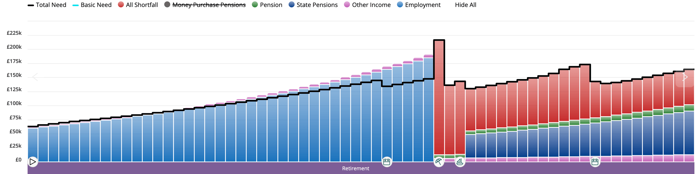 The orange shows the private pension filling the income gap - the plan works...